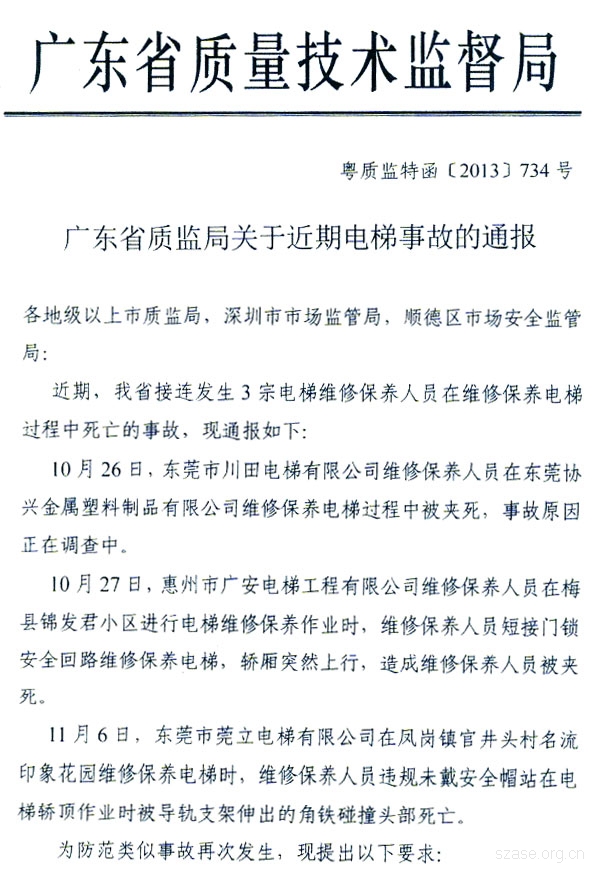 广东省质监局关于近期电梯事故的通报