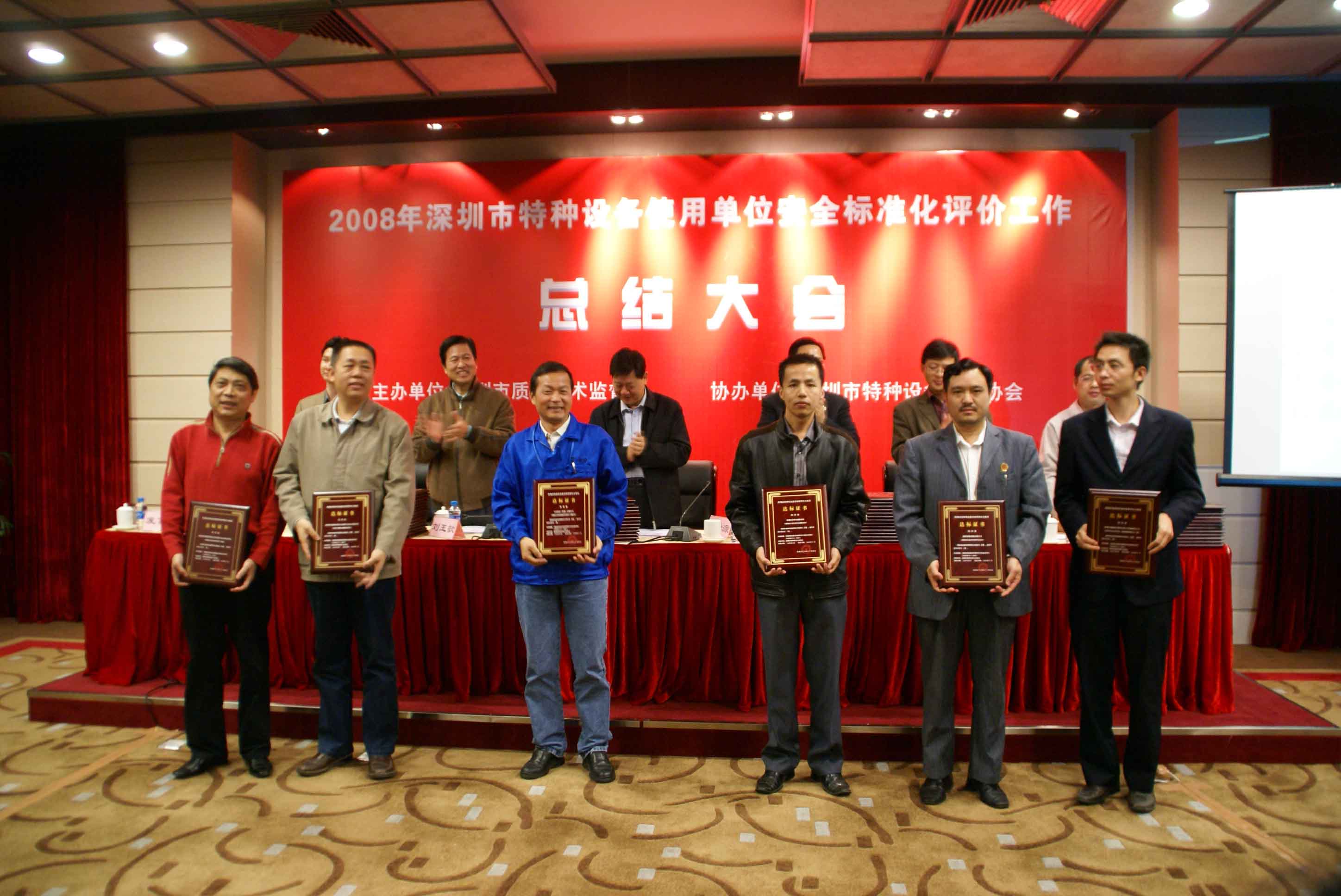 会议由市质监局特设处张向忠副处长主持,刘玉歆处长作2008年深圳市特种设备使用单位安全标准化工作总结;会议指出,在市质监局的正确领导下,各分局、市特检院、市特设协会克服安全形势严峻、工作任务繁重的困难,积极争取被评价单位的支持,协同作战,奋力拼搏,提前2个月圆满完成安全标准评价工作任务,把我市特种设备安全监管工作推上一个新的台阶,成绩来自不易。会议提出明年特种设备安全标准化评价工作目标为争取明年再完成80家企业安全标准化评价工作任务,包括对评价达标满3年的企业进行复评,以及对新增重点监控单位和重点场所进行初评。深圳市宝安区公园管理处陈友亮主任和深圳市广前电力有限公司陈秋辉经理作为使用单位代表发言。质监局领导向2008年通过特种设备使用单位安全标准化评价单位发放达标等级证书。
